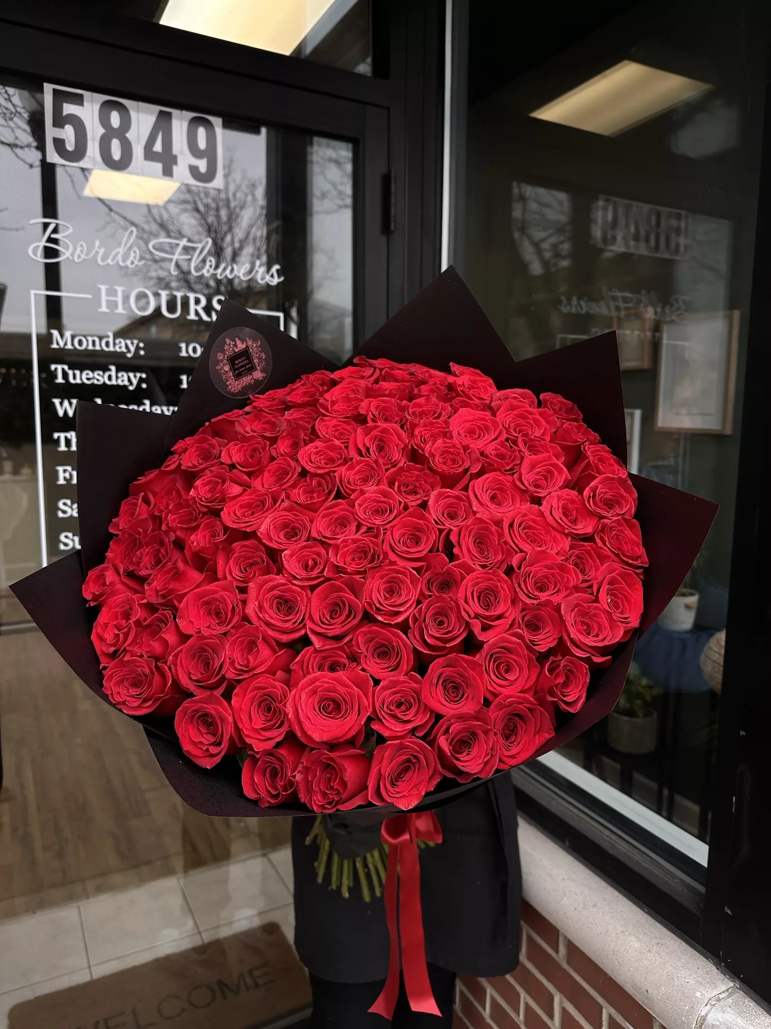 “150 red roses in a bouquet”