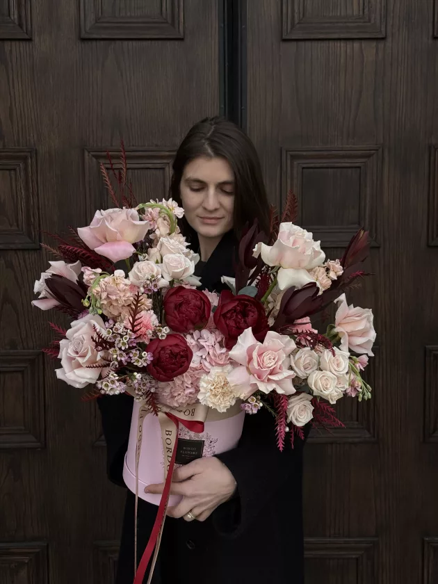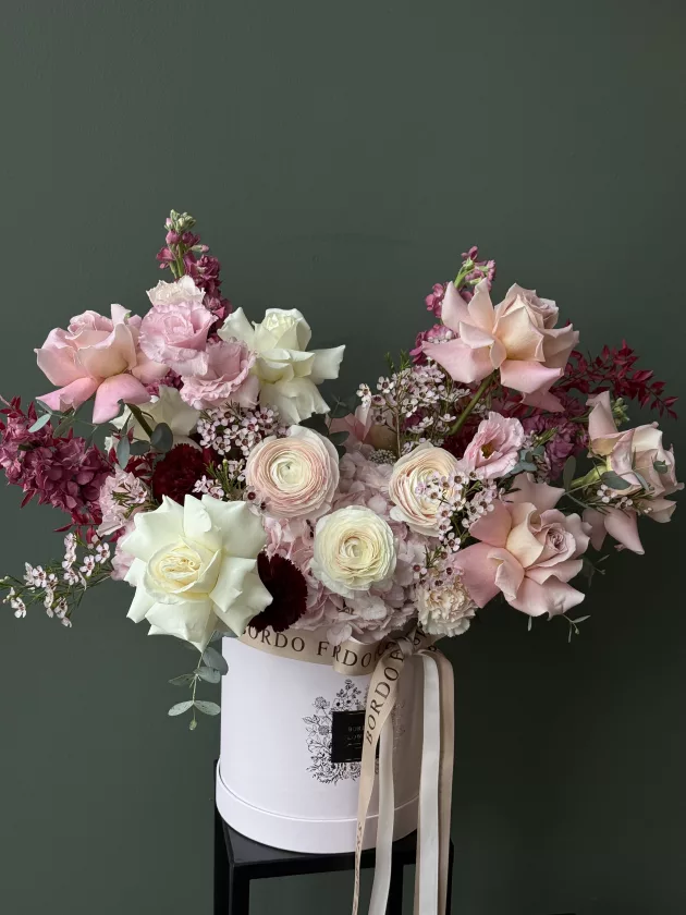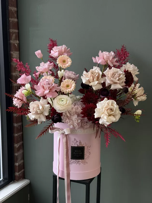 The “Bordo” box arrangement, a best-seller this autumn, features a rich blend of pink and burgundy blooms that embody the season’s warmth and elegance. Its color palette pairs beautifully with any box color—pink, beige, or black—allowing it to adapt to diverse tastes and settings. Perfect for fall, this arrangement adds a touch of luxury and seasonal charm wherever it’s displayed.