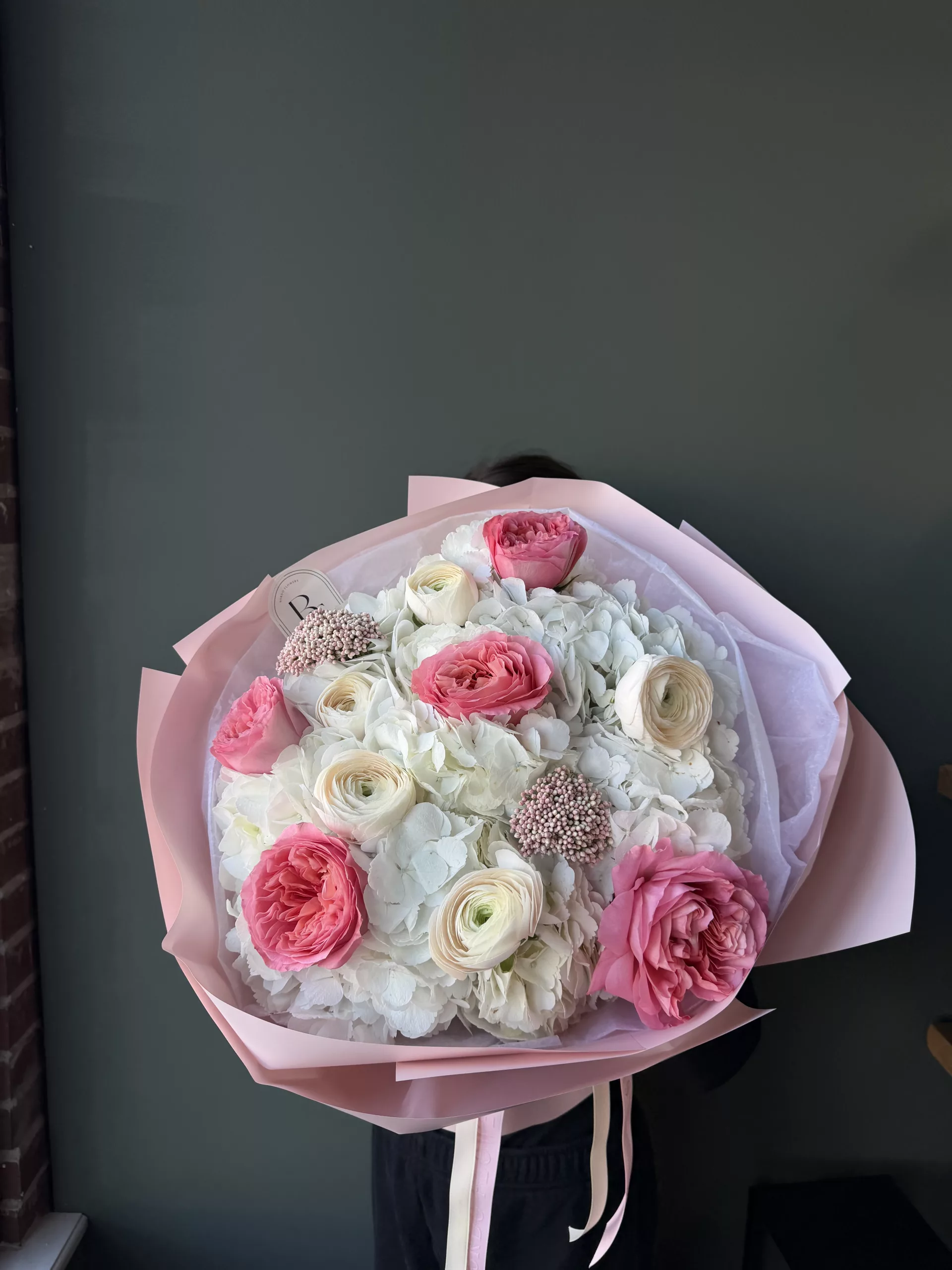 “Dreamy Date” is a romantic Valentine’s bouquet created to celebrate love in its most enchanting form. Designed in a luxurious palette of soft blush pink and candy expression garden roses, this arrangement blends lush hydrangeas with premium ranunculuses, creating a full yet delicate composition rich in texture and emotion.