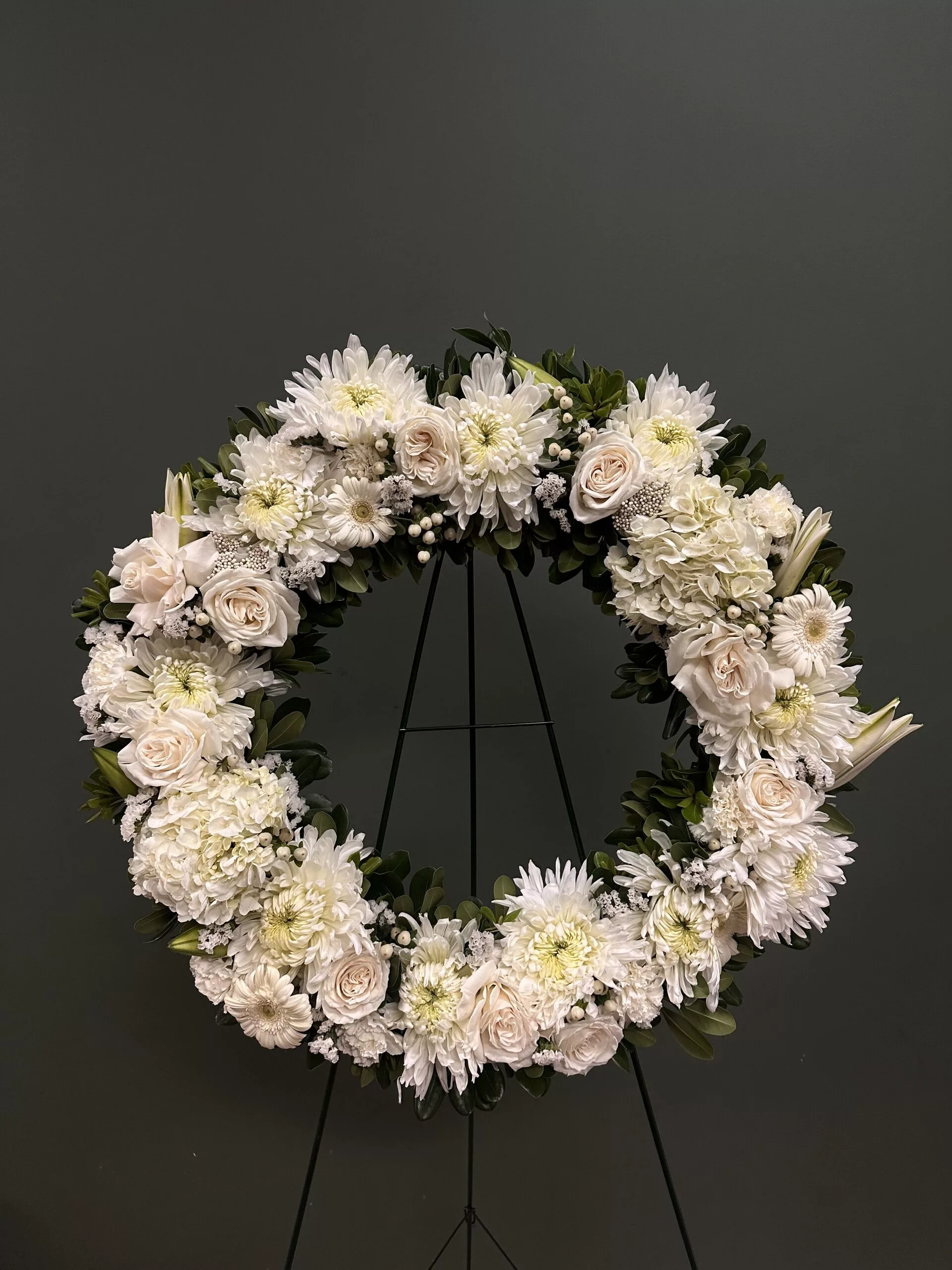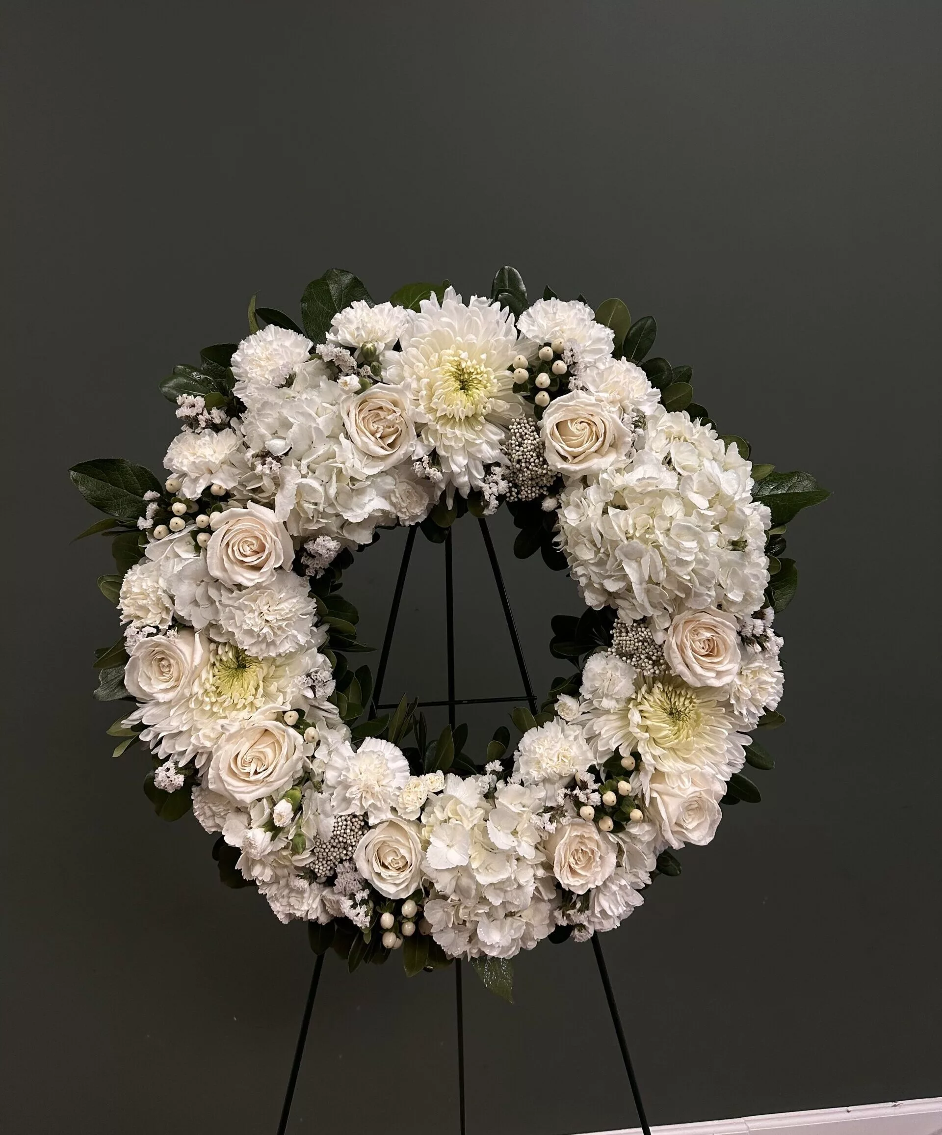 Funeral Wreath White Our Funeral Wreath White is a serene and elegant tribute designed to honor the memory of a loved one. Available in two circular sizes of 18 inches and 22 inches, as well as a heart-shaped option measuring 24 inches, this arrangement beautifully combines pure white flowers with lush greenery. The calming white hues symbolize peace and purity, offering a comforting presence during times of loss. Each wreath is thoughtfully crafted to provide a heartfelt expression of sympathy, making it a fitting choice for memorial services and funerals. Let this gentle arrangement convey your love and respect in a dignified manner.