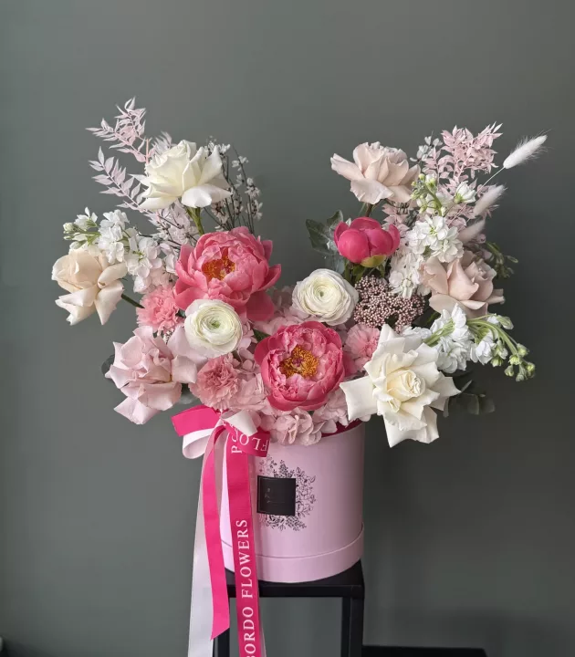 “Raspberry Tart”– A spring arrangement with vibrant raspberry pink blooms and complemented by soft beige accents, this stunning display exudes elegance and sweetness. Each flower is thoughtfully arranged to create a harmonious blend of color and texture, making it a perfect gift or centerpiece for any occasion. The arrangement is presented in a pink box, adorned with a matching tones of pink ribbons, adding a touch of sophistication and playful to the design.