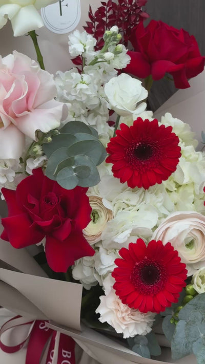 “Cutie Red” bouquet — an elegant arrangement featuring a refined blend of fresh white and red flowers, designed in our signature style for a timeless and romantic look. Flower selection may vary based on availability, but we always stay true to the overall look. Our manager will contact you to confirm the design before delivery.