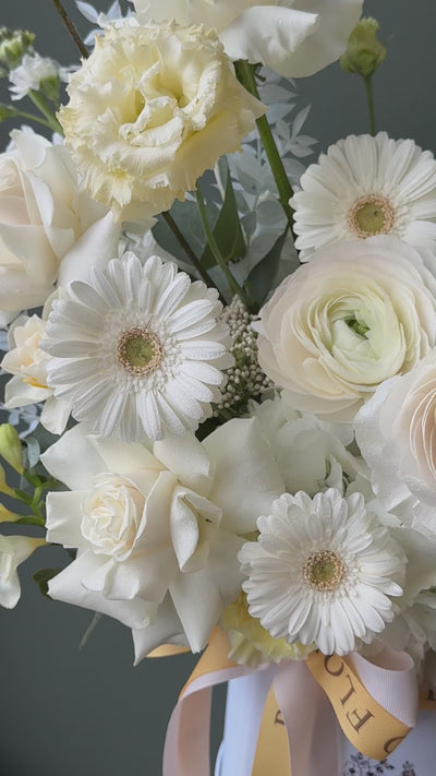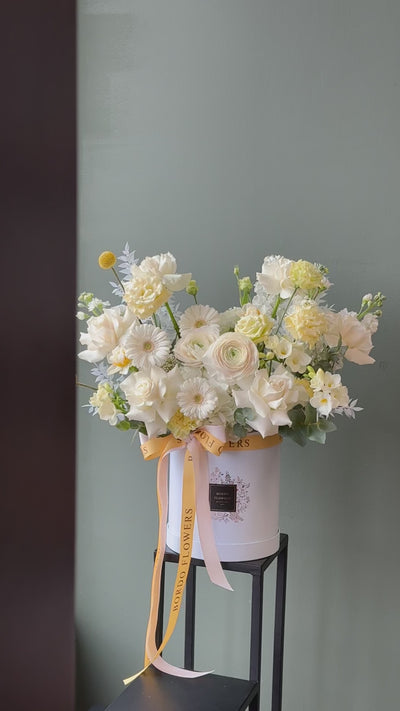 “Sun and Sea” arrangement — a fresh and uplifting floral design in a blue box, featuring a soft blend of white and buttery yellow flowers. Inspired by coastal light and warm sunshine, it brings a bright, airy feel to any space.